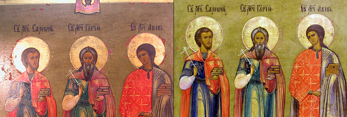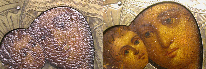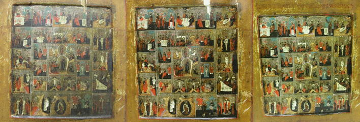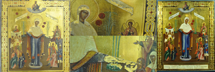 Particularly the methods of clearing the latest layers from icons have been changed. Traditional ways of clearing by means of softening the retouching using compresses with organic dissolvents and then their removal with scalpel gave way for careful and scrupulous work under the microscope. Special micro instruments came up to take usual medical scalpels’ place. Macro- and microphotography became customary for everyday control of conservation conducting.