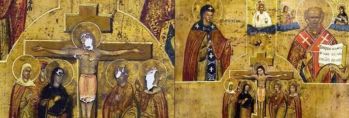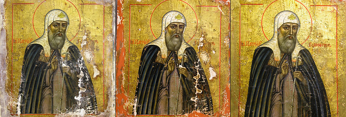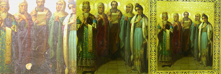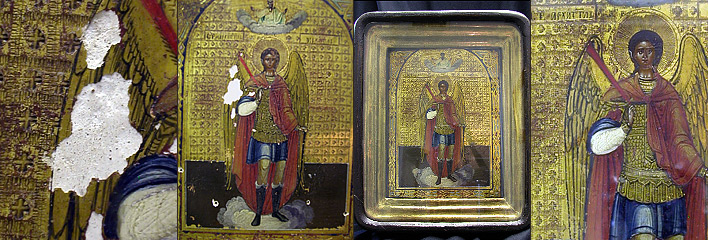 Icons restoration and conservation should reduce the number of operations as much as possible, all newly added elements should be singled out, all additions executed in a modern style. Modern methods of restoration permit the application of all latest achievements of science and diverse physicochemical methods of research for the strengthening of object of art. Diverse materials may be used in the process of restoration but on the surface they should be close to the original materials of the icon and be reversible.